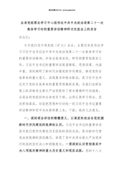 【七哥公文】2025年:【七哥公文】在局党组理论学习中心组传达中共中央政治局第二十一次集体学习时的重要讲话精神研讨交流会上的发言+更多免费公文+VX:QiGeGongWen2024+更多免费公文+VX:QiGeGongWen2024