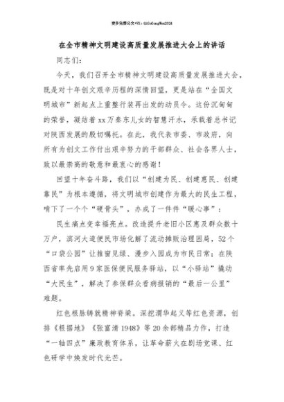 【七哥公文】2025年:【七哥公文】在全市精神文明建设高质量发展推进大会上的讲话+更多免费公文+VX:QiGeGongWen2024+更多免费公文+VX:QiGeGongWen2024