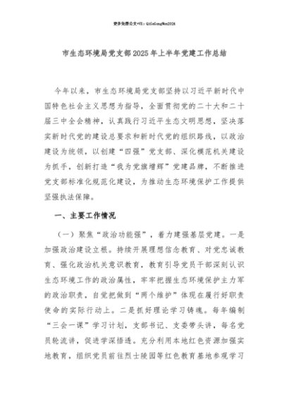 【七哥公文】2025年:【七哥公文】市生态环境局党支部2025年上半年党建工作总结+更多免费公文+VX:QiGeGongWen2024+更多免费公文+VX:QiGeGongWen2024