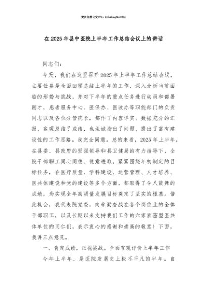 【七哥公文】2025年:【七哥公文】在2025年县中医院上半年工作总结会议上的讲话+更多免费公文+VX:QiGeGongWen2024+更多免费公文+VX:QiGeGongWen2024