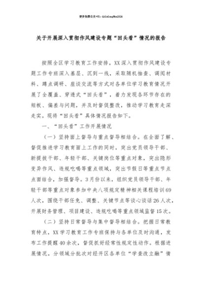 【七哥公文】2025年:【七哥公文】关于开展深入贯彻作风建设专题“回头看”情况的报告+更多免费公文+VX:QiGeGongWen2024+更多免费公文+VX:QiGeGongWen2024
