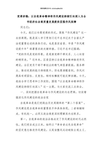 【七哥公文】2025年:【七哥公文】党课讲稿:以自我革命精神将作风建设持续引向深入为全市经济社会高质量发展提供坚强作风保障+更多免费公文+VX:QiGeGongWen2024+更多免费公文+VX:QiGeGongWen2024