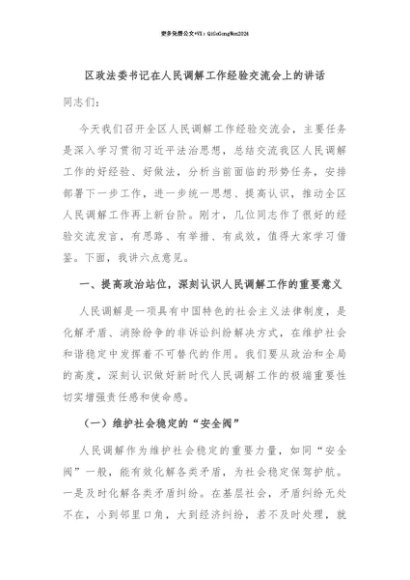 【七哥公文】2025年:【七哥公文】区政法委书记在人民调解工作经验交流会上的讲话+更多免费公文+VX:QiGeGongWen2024+更多免费公文+VX:QiGeGongWen2024