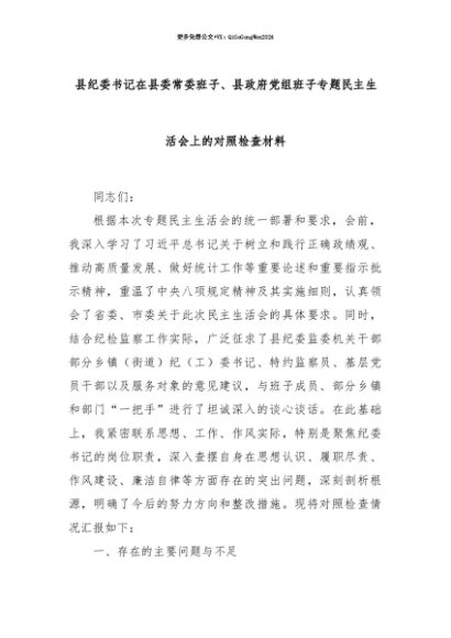 【七哥公文】2025年:【七哥公文】县纪委书记在县委常委班子、县政府党组班子专题民主生活会上的对照检查材料+更多免费公文+VX:QiGeGongWen2024+更多免费公文+VX:QiGeGongWen2024