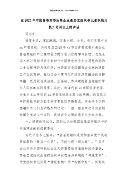 【七哥公文】2025年:【七哥公文】在2025年市国资委党委所属企业基层党组织书记履职能力提升培训班上的讲话+更多免费公文+VX:QiGeGongWen2024+更多免费公文+VX:QiGeGongWen2024