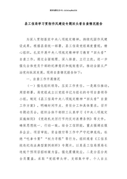 【七哥公文】2025年:【七哥公文】县工信局学习贯彻作风建设专题回头看自查情况报告+更多免费公文+VX:QiGeGongWen2024+更多免费公文+VX:QiGeGongWen2024