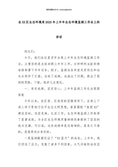 【七哥公文】2025年:【七哥公文】在XX区生态环境局2025年上半年生态环境监测工作会上的讲话+更多免费公文+VX:QiGeGongWen2024+更多免费公文+VX:QiGeGongWen2024