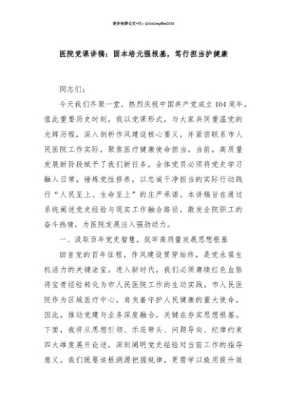 【七哥公文】2025年:【七哥公文】医院党课讲稿:固本培元强根基,笃行担当护健康+更多免费公文+VX:QiGeGongWen2024+更多免费公文+VX:QiGeGongWen2024