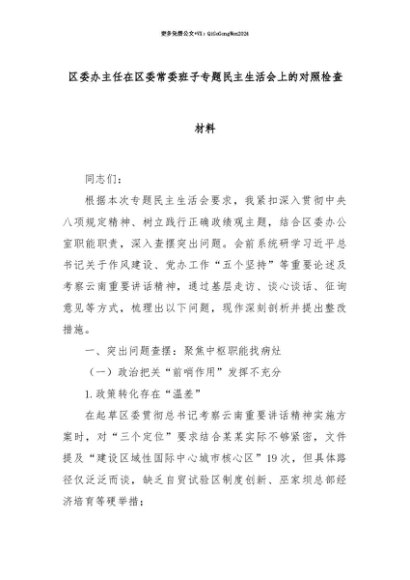 【七哥公文】2025年:【七哥公文】区委办主任在区委常委班子专题民主生活会上的对照检查材料+更多免费公文+VX:QiGeGongWen2024+更多免费公文+VX:QiGeGongWen2024
