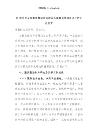 【七哥公文】2025年:【七哥公文】在2025年全市整改整治和为群众办实事成效通报会上的汇报发言+更多免费公文+VX:QiGeGongWen2024+更多免费公文+VX:QiGeGongWen2024