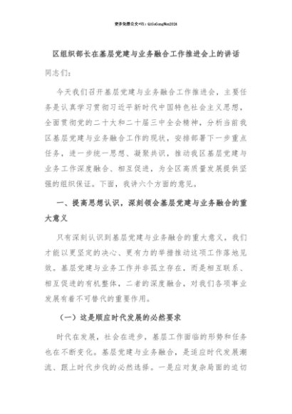 【七哥公文】2025年:【七哥公文】区组织部长在基层党建与业务融合工作推进会上的讲话+更多免费公文+VX:QiGeGongWen2024+更多免费公文+VX:QiGeGongWen2024
