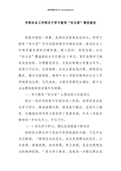 【七哥公文】2025年:【七哥公文】市委社会工作部关于学习教育“回头看”情况报告+更多免费公文+VX:QiGeGongWen2024+更多免费公文+VX:QiGeGongWen2024