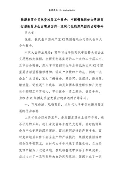 【七哥公文】2025年:【七哥公文】能源集团公司党委换届工作报告:牢记嘱托担使命勇毅前行谱新篇为全面建成国内一流现代化能源集团而团结奋斗+更多免费公文+VX:QiGeGongWen2024+更多免费公文+VX:QiGeGongWen2024
