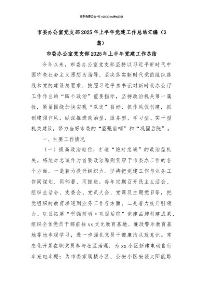【七哥公文】2025年:【七哥公文】(3篇)市委办公室党支部2025年上半年党建工作总结汇编+更多免费公文+VX:QiGeGongWen2024+更多免费公文+VX:QiGeGongWen2024