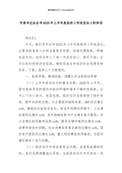 【七哥公文】2025年:【七哥公文】市委书记在全市2025年上半年度经济工作攻坚会上的讲话+更多免费公文+VX:QiGeGongWen2024+更多免费公文+VX:QiGeGongWen2024