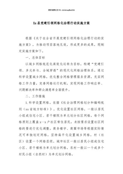 【七哥公文】2025年:【七哥公文】Xx县党建引领网格化治理行动实施方案+更多免费公文+VX:QiGeGongWen2024+更多免费公文+VX:QiGeGongWen2024