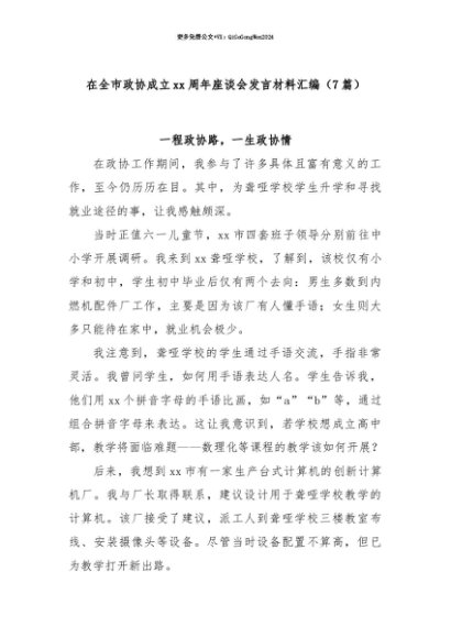 【七哥公文】2025年:【七哥公文】(7篇)在全市政协成立xx周年座谈会发言材料汇编+更多免费公文+VX:QiGeGongWen2024+更多免费公文+VX:QiGeGongWen2024