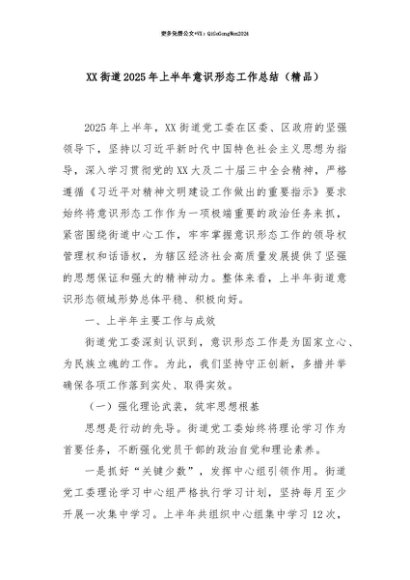 【七哥公文】2025年:【七哥公文】XX街道2025年上半年意识形态工作总结(精品)+更多免费公文+VX:QiGeGongWen2024+更多免费公文+VX:QiGeGongWen2024