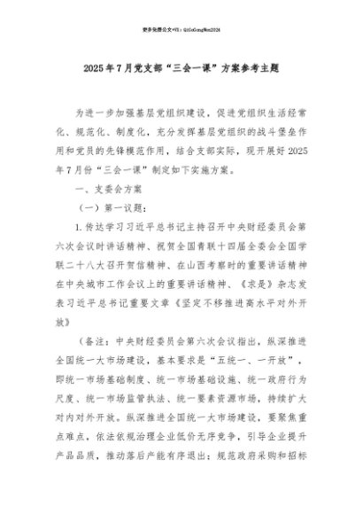 【七哥公文】2025年:【七哥公文】2025年7月党支部“三会一课”方案参考主题+更多免费公文+VX:QiGeGongWen2024+更多免费公文+VX:QiGeGongWen2024
