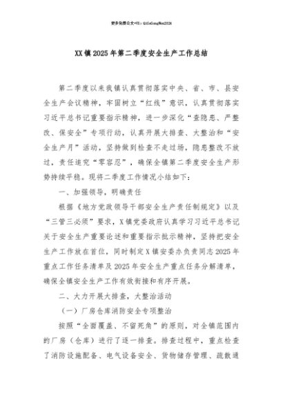 【七哥公文】2025年:【七哥公文】XX镇2025年第二季度安全生产工作总结+更多免费公文+VX:QiGeGongWen2024+更多免费公文+VX:QiGeGongWen2024