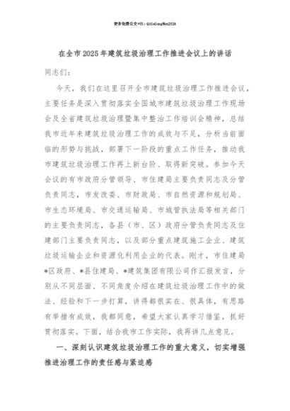 【七哥公文】2025年:【七哥公文】在全市2025年建筑垃圾治理工作推进会议上的讲话+更多免费公文+VX:QiGeGongWen2024+更多免费公文+VX:QiGeGongWen2024