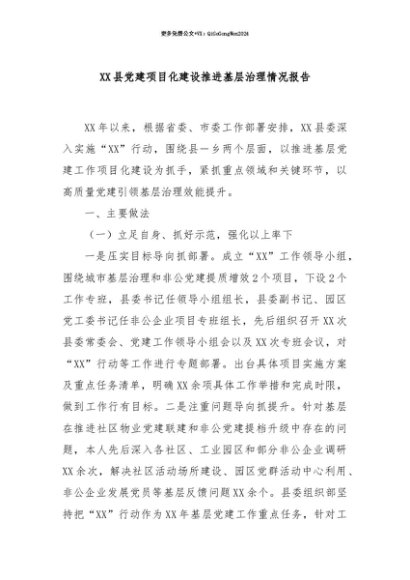【七哥公文】2025年:【七哥公文】XX县党建项目化建设推进基层治理情况报告+更多免费公文+VX:QiGeGongWen2024+更多免费公文+VX:QiGeGongWen2024