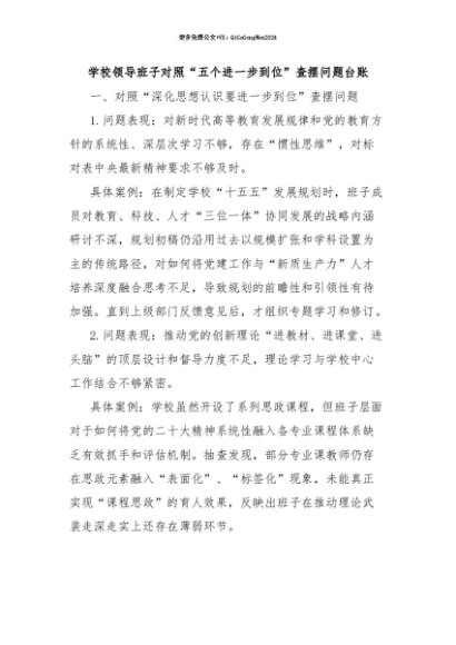 【七哥公文】2025年:【七哥公文】学校领导班子对照“五个进一步到位”查摆问题台账+更多免费公文+VX:QiGeGongWen2024+更多免费公文+VX:QiGeGongWen2024