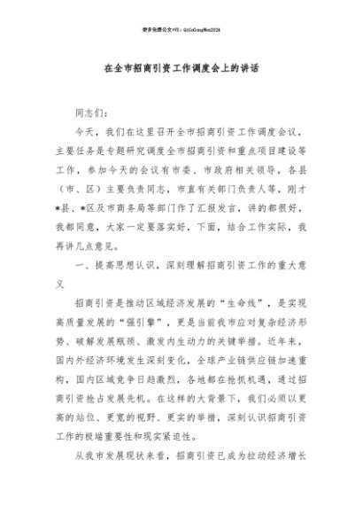 【七哥公文】2025年:【七哥公文】在全市招商引资工作调度会上的讲话+更多免费公文+VX:QiGeGongWen2024+更多免费公文+VX:QiGeGongWen2024