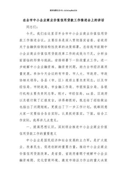 【七哥公文】2025年:【七哥公文】在全市中小企业商业价值信用贷款工作推进会上的讲话+更多免费公文+VX:QiGeGongWen2024+更多免费公文+VX:QiGeGongWen2024