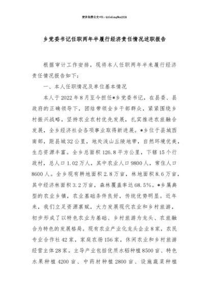 【七哥公文】2025年:【七哥公文】乡党委书记任职两年半履行经济责任情况述职报告+更多免费公文+VX:QiGeGongWen2024+更多免费公文+VX:QiGeGongWen2024