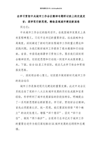 【七哥公文】2025年:【七哥公文】在学习贯彻中央城市工作会议精神专题研讨班上的交流发言:深学笃行新思想,精绘县域城市建设新画卷+更多免费公文+VX:QiGeGongWen2024+更多免费公文+VX:QiGeGongWen2024