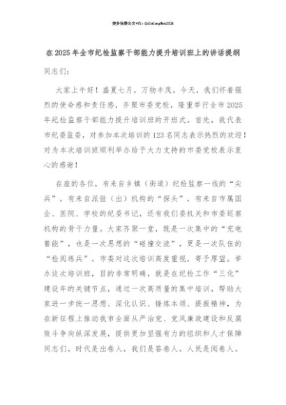 【七哥公文】2025年:【七哥公文】在2025年全市纪检监察干部能力提升培训班上的讲话提纲+更多免费公文+VX:QiGeGongWen2024+更多免费公文+VX:QiGeGongWen2024