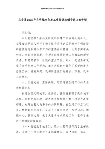 【七哥公文】2025年:【七哥公文】在全县2025年文明城市创建工作协调机制会议上的讲话+更多免费公文+VX:QiGeGongWen2024+更多免费公文+VX:QiGeGongWen2024