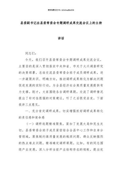 【七哥公文】2025年:【七哥公文】县委副书记在县委常委会专题调研成果交流会议上的主持讲话+更多免费公文+VX:QiGeGongWen2024+更多免费公文+VX:QiGeGongWen2024