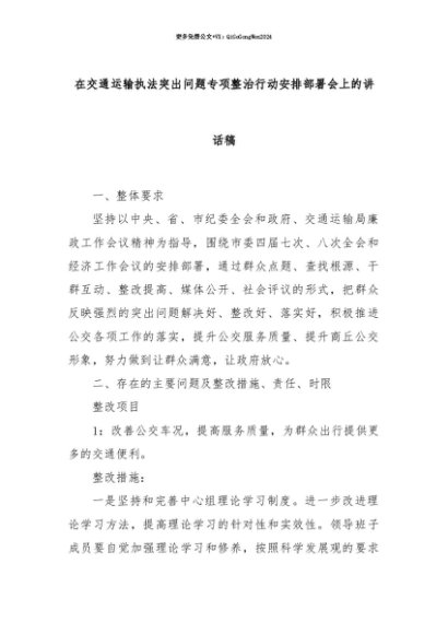 【七哥公文】2025年:【七哥公文】在交通运输执法突出问题专项整治行动安排部署会上的讲话稿+更多免费公文+VX:QiGeGongWen2024+更多免费公文+VX:QiGeGongWen2024