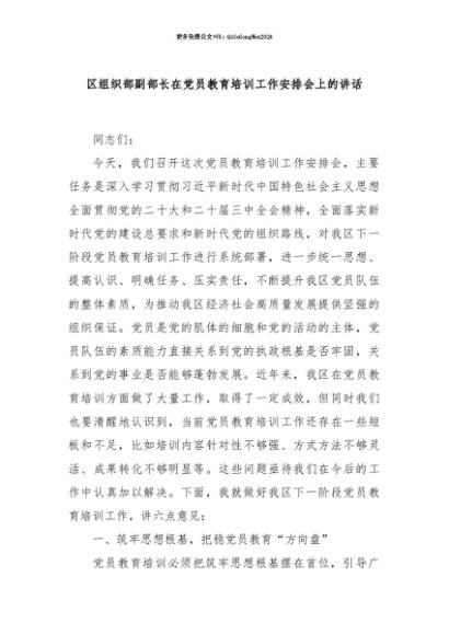 【七哥公文】2025年:【七哥公文】区组织部副部长在党员教育培训工作安排会上的讲话+更多免费公文+VX:QiGeGongWen2024+更多免费公文+VX:QiGeGongWen2024