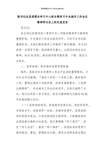 【七哥公文】2025年:【七哥公文】副书记在县委理论学习中心组专题学习中央城市工作会议精神研讨会上的交流发言+更多免费公文+VX:QiGeGongWen2024+更多免费公文+VX:QiGeGongWen2024