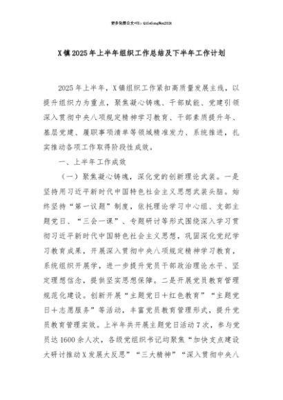 【七哥公文】2025年:【七哥公文】X镇2025年上半年组织工作总结及下半年工作计划+更多免费公文+VX:QiGeGongWen2024+更多免费公文+VX:QiGeGongWen2024