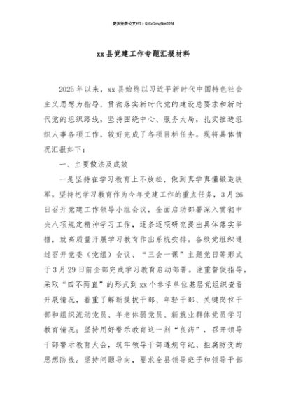【七哥公文】2025年:【七哥公文】xx县党建工作专题汇报材料+更多免费公文+VX:QiGeGongWen2024+更多免费公文+VX:QiGeGongWen2024
