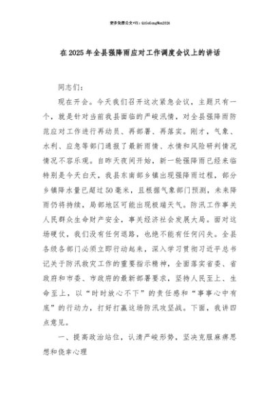 【七哥公文】2025年:【七哥公文】在2025年全县强降雨应对工作调度会议上的讲话+更多免费公文+VX:QiGeGongWen2024+更多免费公文+VX:QiGeGongWen2024