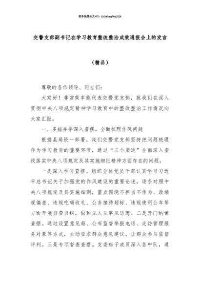 【七哥公文】2025年:【七哥公文】交警支部副书记在学习教育整改整治成效通报会上的发言(精品)+更多免费公文+VX:QiGeGongWen2024+更多免费公文+VX:QiGeGongWen2024