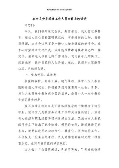【七哥公文】2025年:【七哥公文】在全县劳务派遣工作人员会议上的讲话+更多免费公文+VX:QiGeGongWen2024+更多免费公文+VX:QiGeGongWen2024