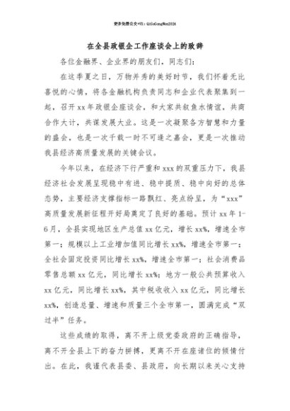 【七哥公文】2025年:【七哥公文】在全县政银企工作座谈会上的致辞+更多免费公文+VX:QiGeGongWen2024+更多免费公文+VX:QiGeGongWen2024