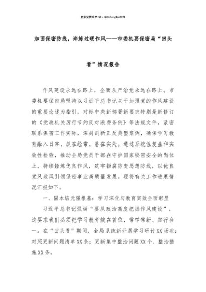 【七哥公文】2025年:【七哥公文】加固保密防线,淬炼过硬作风——市委机要保密局“回头看”情况报告+更多免费公文+VX:QiGeGongWen2024+更多免费公文+VX:QiGeGongWen2024