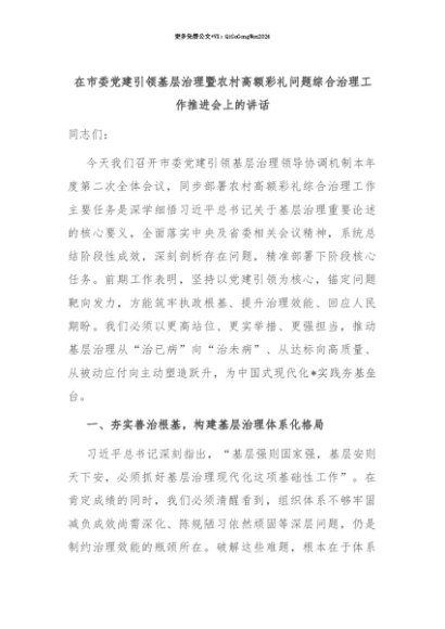 【七哥公文】2025年:【七哥公文】在市委党建引领基层治理暨农村高额彩礼问题综合治理工作推进会上的讲话+更多免费公文+VX:QiGeGongWen2024+更多免费公文+VX:QiGeGongWen2024