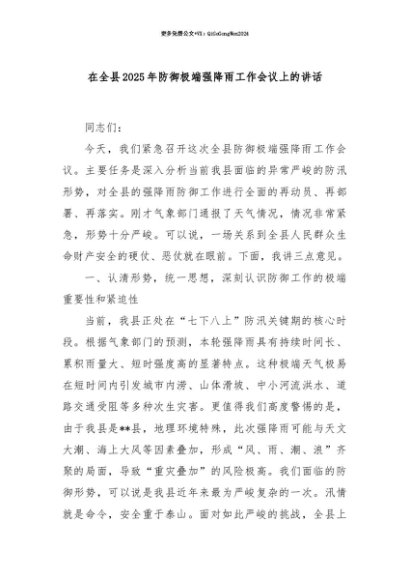 【七哥公文】2025年:【七哥公文】在全县2025年防御极端强降雨工作会议上的讲话+更多免费公文+VX:QiGeGongWen2024+更多免费公文+VX:QiGeGongWen2024