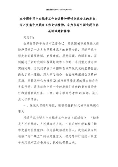 【七哥公文】2025年:【七哥公文】在专题学习中央城市工作会议精神研讨交流会上的发言:深入贯彻中央城市工作会议精神,奋力书写中国式现代化县域城建新篇章+更多免费公文+VX:QiGeGongWen2024+更多免费公文+VX:QiGeGongWen2024