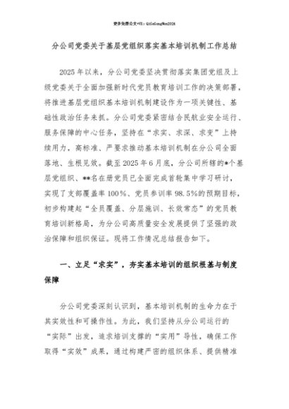 【七哥公文】2025年:【七哥公文】分公司党委关于基层党组织落实基本培训机制工作总结+更多免费公文+VX:QiGeGongWen2024+更多免费公文+VX:QiGeGongWen2024
