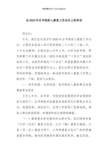 【七哥公文】2025年:【七哥公文】在2025年全市残疾人康复工作会议上的讲话+更多免费公文+VX:QiGeGongWen2024+更多免费公文+VX:QiGeGongWen2024