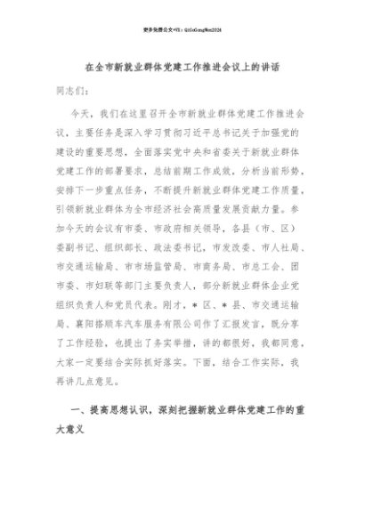【七哥公文】2025年:【七哥公文】在全市新就业群体党建工作推进会议上的讲话+更多免费公文+VX:QiGeGongWen2024+更多免费公文+VX:QiGeGongWen2024